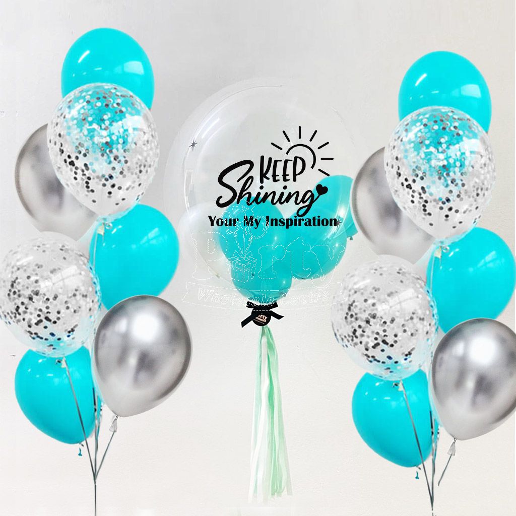 - 20inch Transparent Bubble Balloons filled with mini teal & white balloons