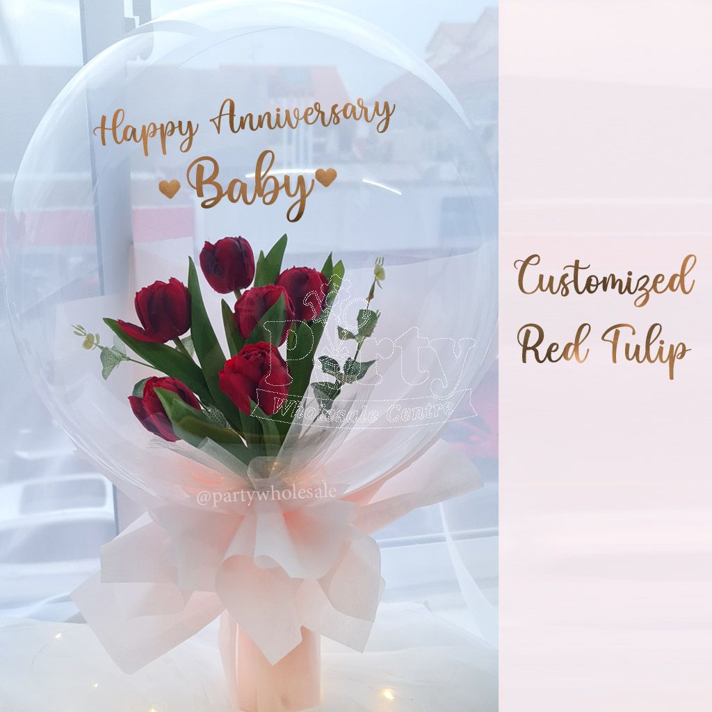 - 6 Stalks of Everlasting Red Tulip inside a transparent bubble balloon